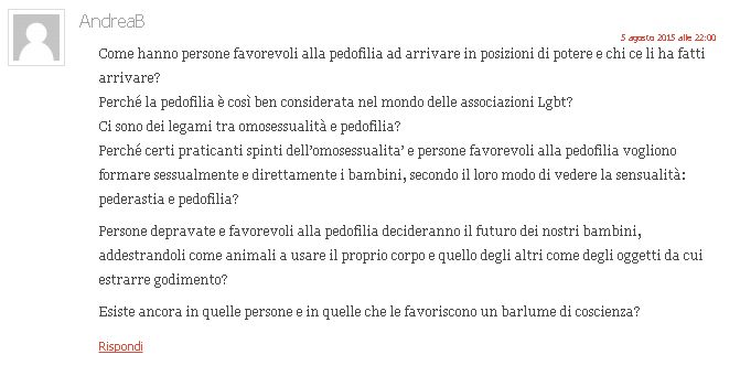 Ovviamente i lettori di Tempi non hanno perso un solo memento per scegliere quella seconda opzione e la pagina del giornale integralista strabocca di commenti volti a sostenere che i gay siano dei pedofili. Tanto si sa che in Italia è lecito ricorrere sempre l’insulto gratuito e alla diffusione di menzogne volte solo ad alimentare odio…